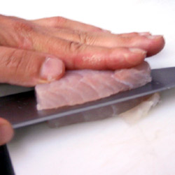 | 1- Corte o filé de robalo ao meio. |
